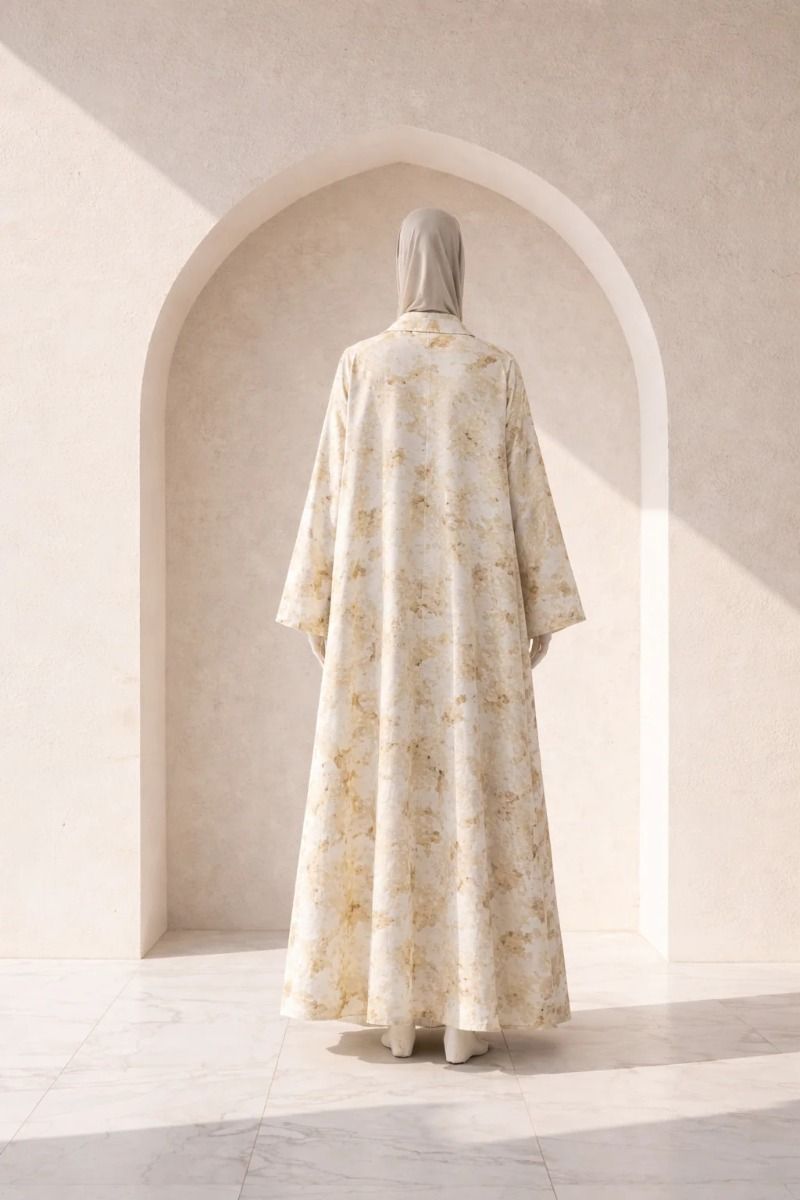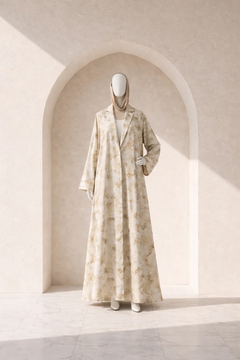 Hatun Ibtikar brings a fresh, modern touch to modest wear. Designed with a blazer-inspired silhouette, this abaya offers a structured yet relaxed look that feels both smart and effortless.Crafted in lightweight meterial with an off white and olive green shades, it’s perfect for workdays, casual outings, or easy layering. Clean lines, a button closure, and a matching sheila come together to create a look that’s polished, comfortable, and easy to wear all day.