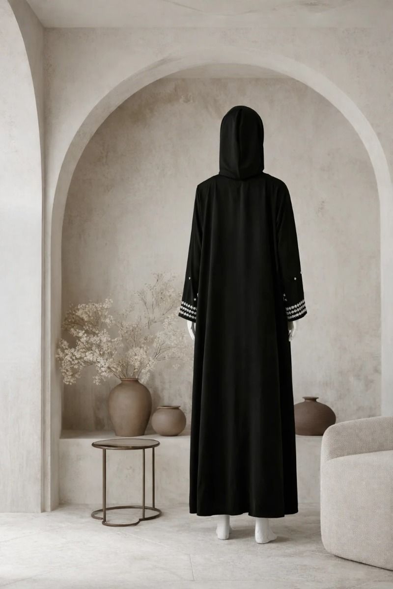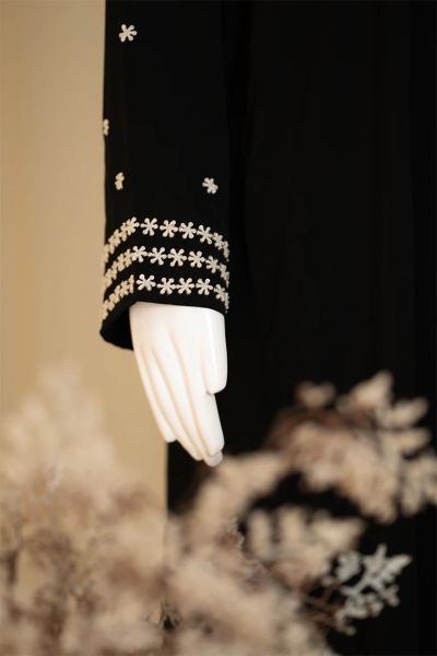Hatun Nazm is made for moments that call for quiet elegance. Designed in a classic black shade, this semi-party wear abaya blends modesty with refined detailing. The soft white embellishments on the sleeves add a gentle touch of charm, while the graceful fall of the fabric keeps the look effortless. Paired with a matching sheila, Hatun Nazm is a timeless choice for evenings, gatherings, and special occasions.