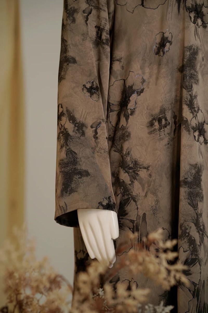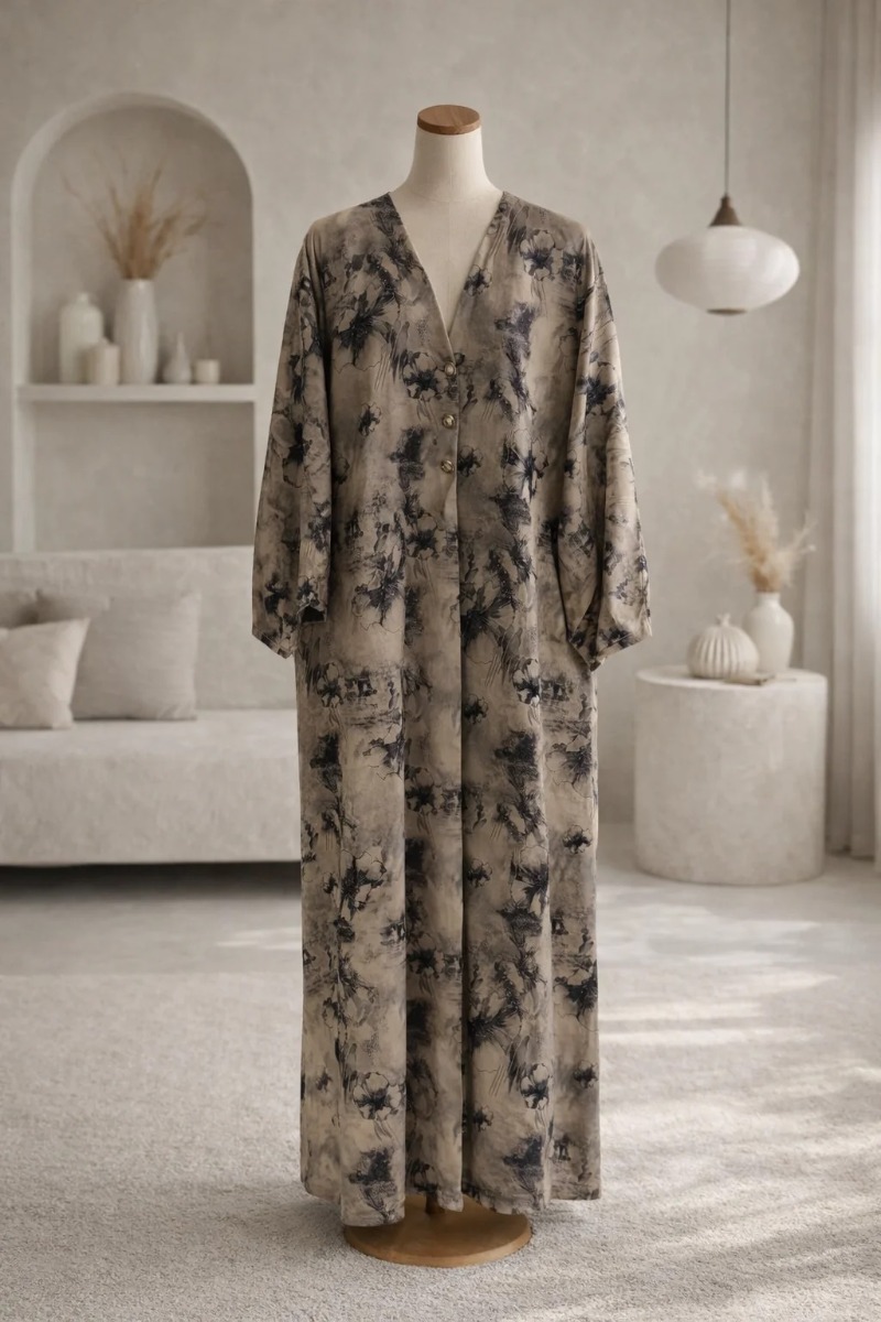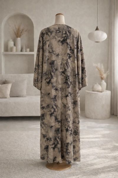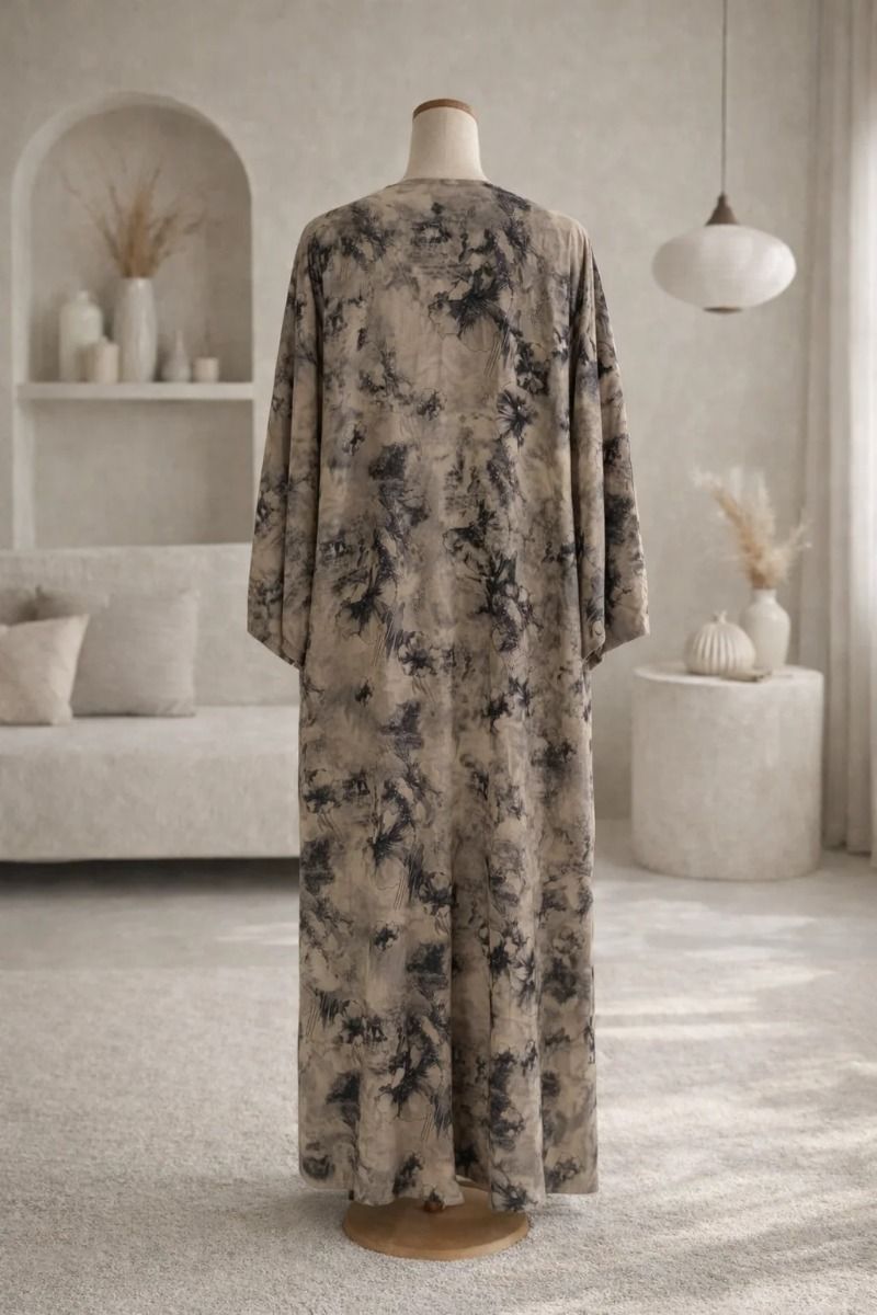 Hatun Sukoon is designed for days when comfort matters just as much as style. This casual abaya features a modern beige and black mottled pattern that feels relaxed yet thoughtfully styled. Crafted from rich jacquard fabric, it has a subtle texture and a graceful drape that adds a touch of quiet luxury to everyday wear. With a simple V-neckline and a minimal button detail, Hatun Sukoon is perfect for daily outings, casual meetings, or relaxed moments. It comes complete with a matching sheila for an effortless finish.