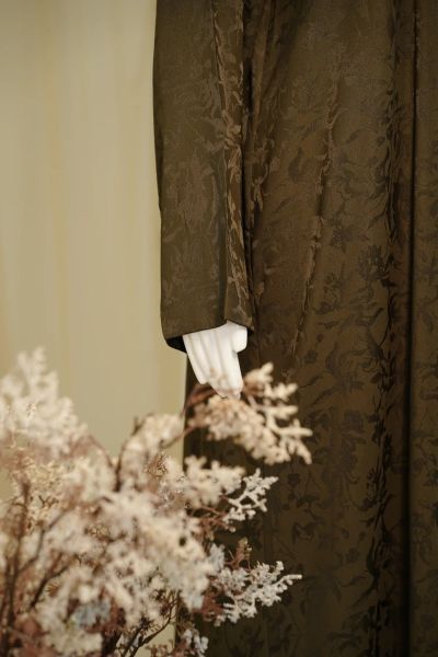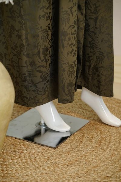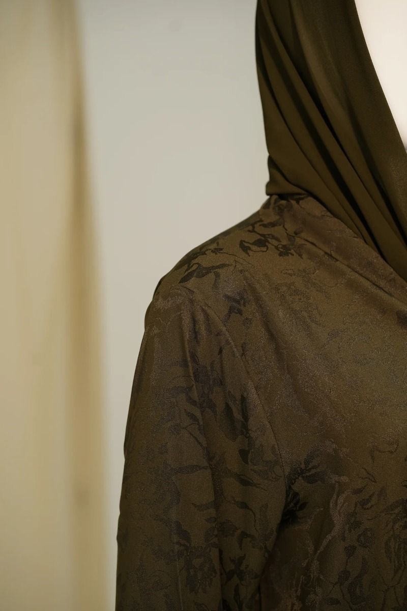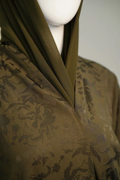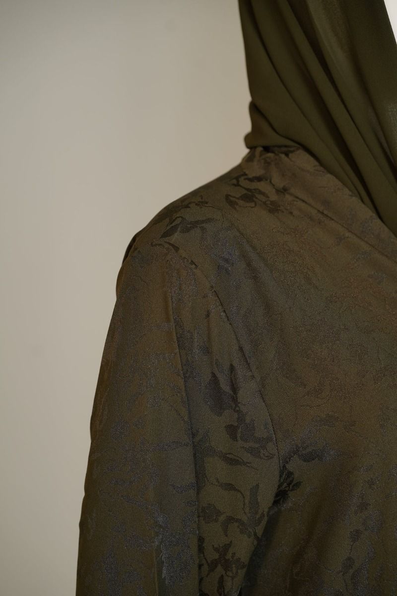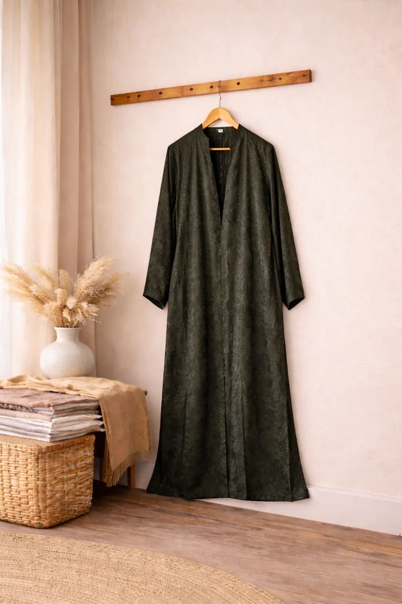 This open abaya is made for effortless layering with a touch of quiet luxury. Designed in a deep charcoal or classic green tone, it features a subtle jacquard pattern that adds texture and depth without being overpowering. Worn open over a black inner dress, it falls gracefully to create a refined, full-length silhouette. Easy to style yet sophisticated in feel, this piece works beautifully for evening outings, cultural gatherings, or elevating everyday wear. It comes complete with a matching chiffon sheila for a polished finish.