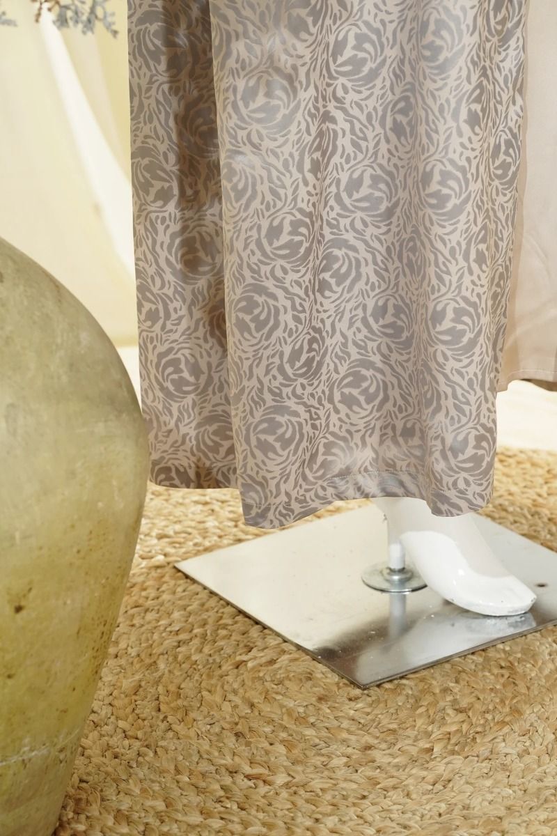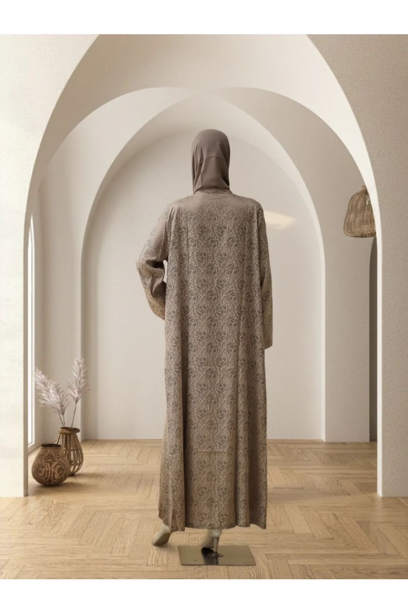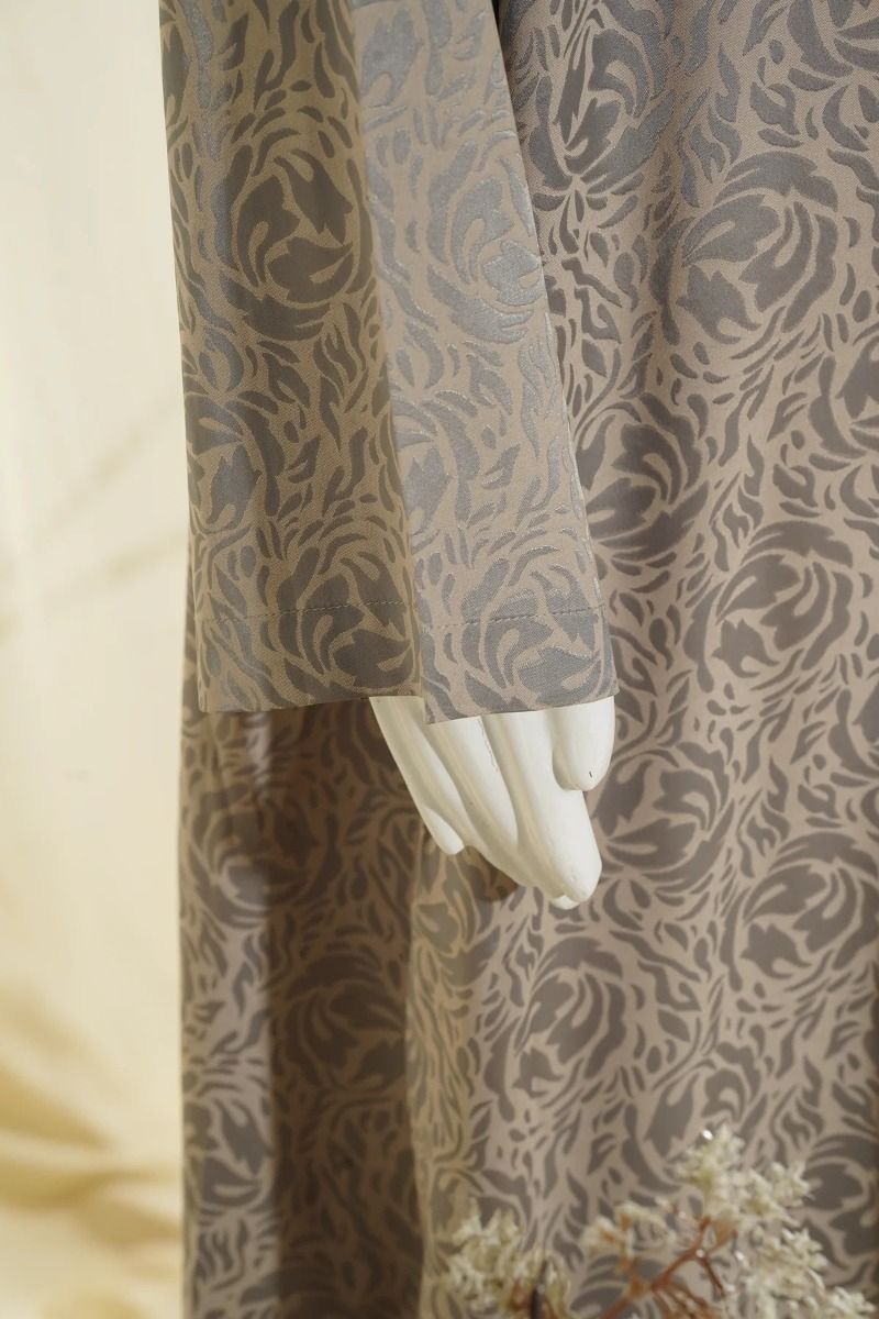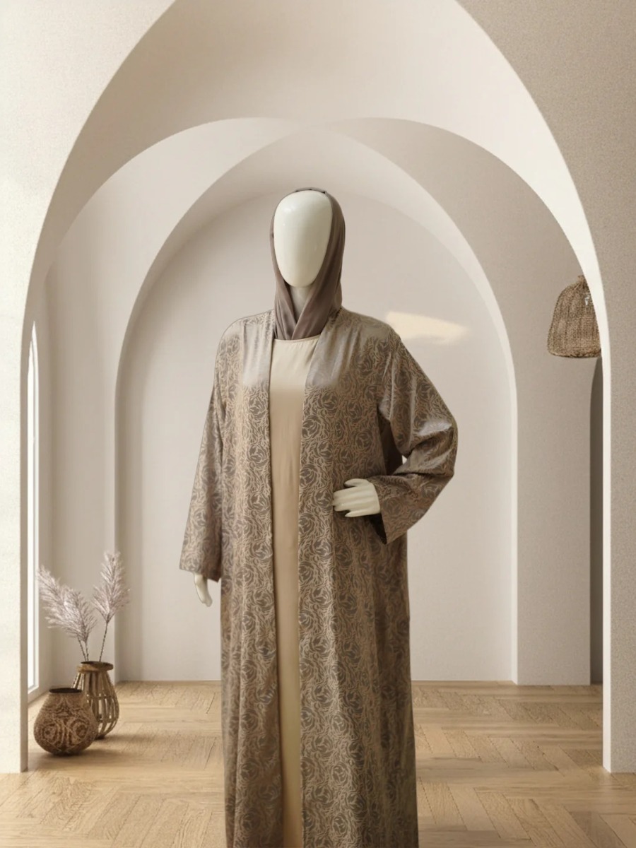This striking casual abaya is designed to add quiet luxury to your everyday layering. Crafted from rich jacquard fabric, it stands out with its beautifully woven texture and soft sheen. The all-over floral or stylised motif in subtle shades of grey and mauve creates depth without feeling heavy, making it effortlessly elegant. Worn open, it flows gracefully over any inner outfit, instantly elevating your look.Perfect for special daytime occasions, refined casual outings, or when you simply want something unique yet comfortable. Finished with a matching chiffone sheila for a complete look.