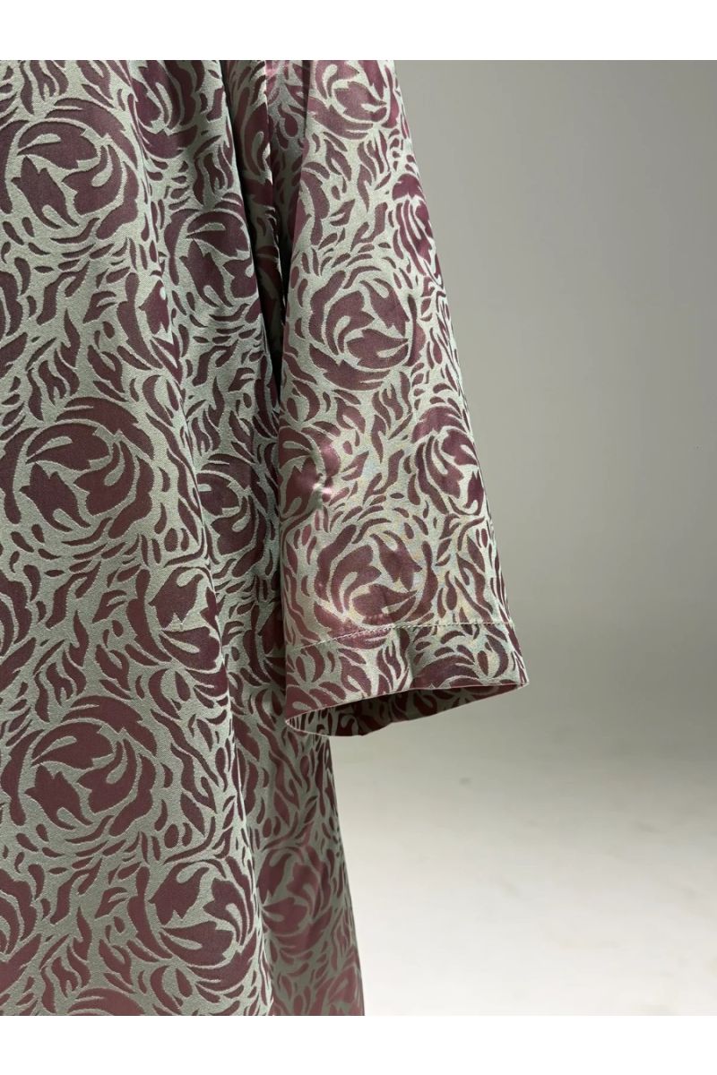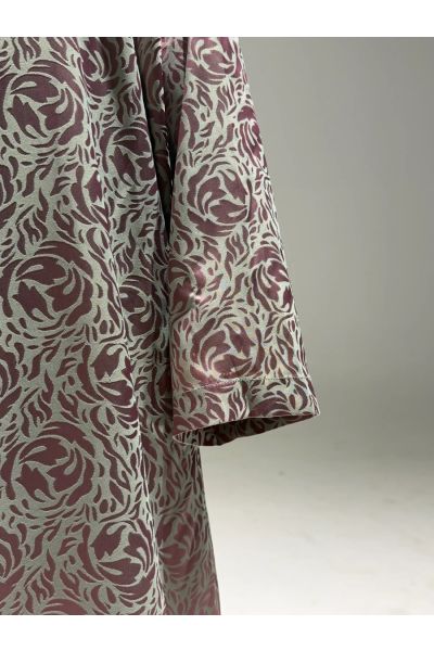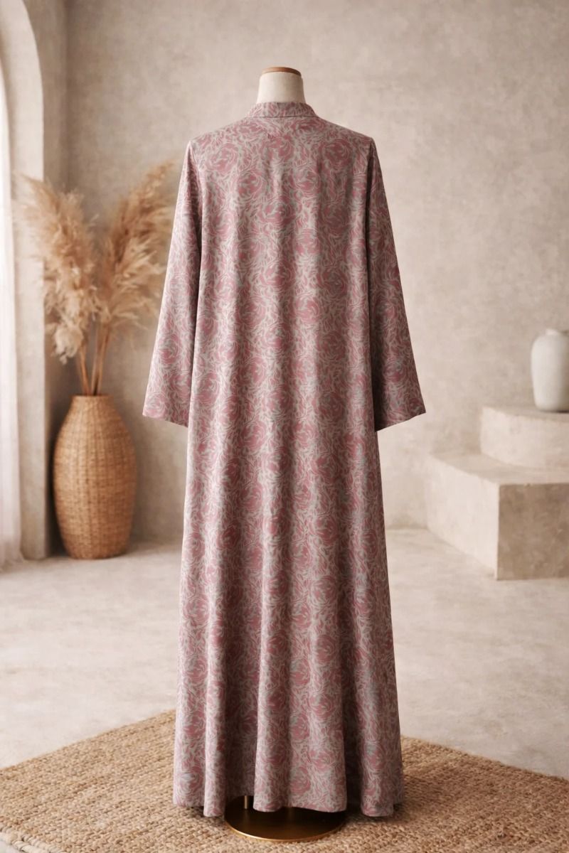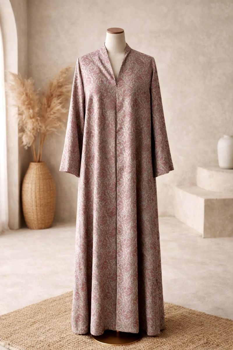 This striking casual abaya is designed to add quiet luxury to your everyday layering. Crafted from rich jacquard fabric, it stands out with its beautifully woven texture and soft sheen. The all-over floral or stylised motif in subtle shades of grey and mauve creates depth without feeling heavy, making it effortlessly elegant. Worn open, it flows gracefully over any inner outfit, instantly elevating your look.Perfect for special daytime occasions, refined casual outings, or when you simply want something unique yet comfortable. Finished with a matching chiffone sheila for a complete look.