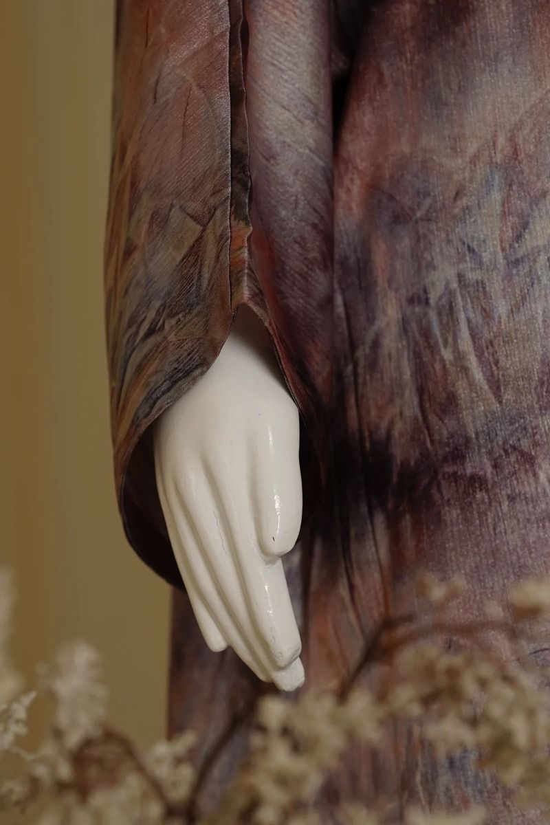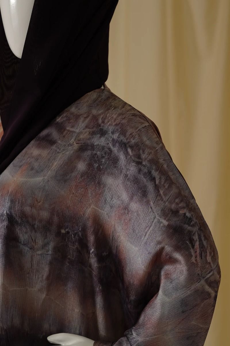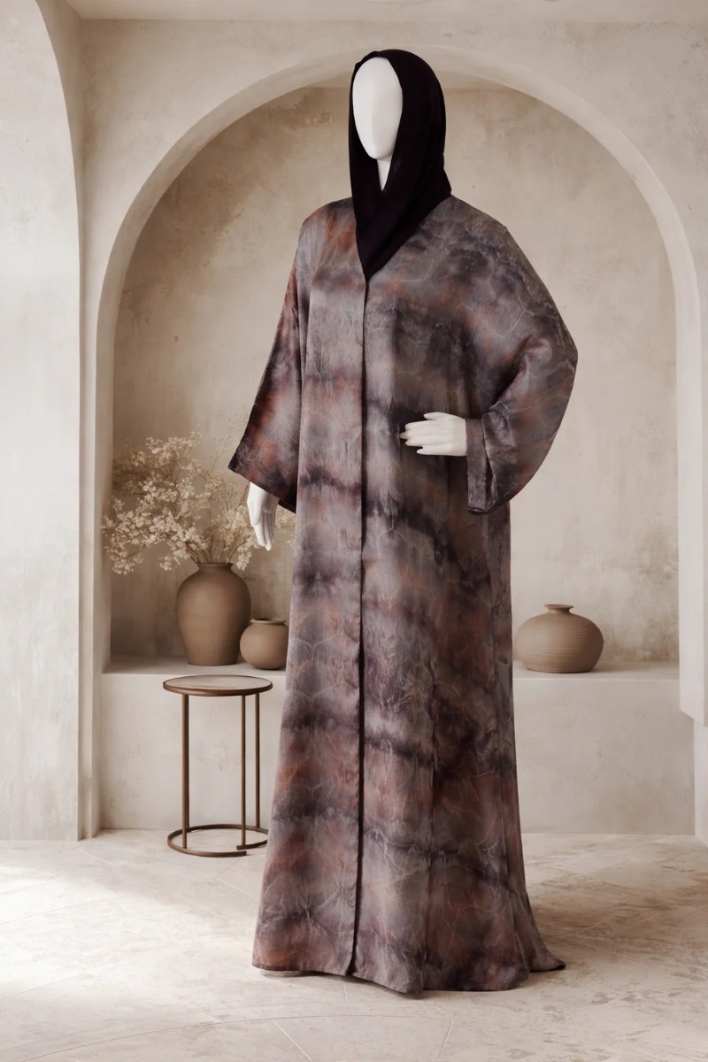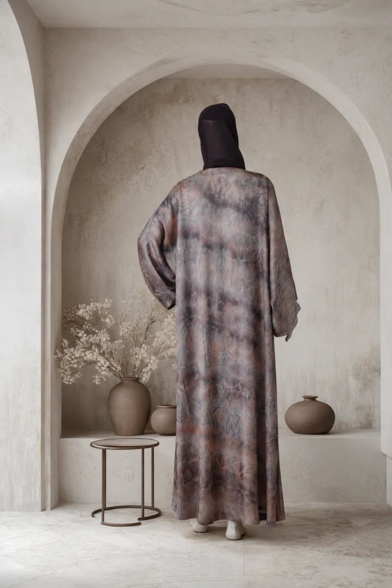 This stylish open abaya brings together comfort and modern elegance. Crafted from smooth Satine fabric, it features a soft sheen and a fluid drape that moves beautifully. The abstract tie-dye pattern in shades of grey, blue, and black gives the abaya a unique, artistic look, making every piece slightly different. Designed with wide butterfly-style sleeves and an open front, it offers a relaxed and flowy fit. Perfect for casual outings or statement everyday wear, this abaya comes with a matching chiffon sheila to complete the look.